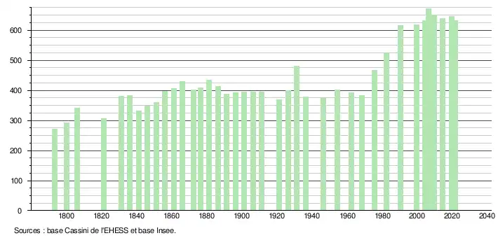 L'évolution du nombre d'habitants est connue à travers les recensements de la population effectués dans la commune depuis 1793. Pour les communes de moins de 10 000 habitants, une enquête de recensement portant sur toute la population est réalisée tous les cinq ans, les populations légales des années intermédiaires étant quant à elles estimées par interpolation ou extrapolation[21]. Pour la commune, le premier recensement exhaustif entrant dans le cadre du nouveau dispositif a été réalisé en 2004[22].