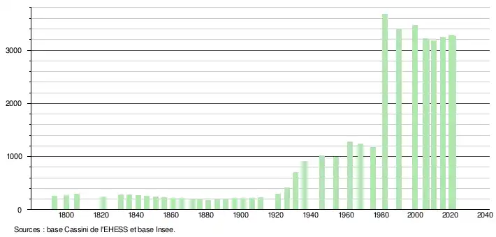 L'évolution du nombre d'habitants est connue à travers les recensements de la population effectués dans la commune depuis 1793. Pour les communes de moins de 10 000 habitants, une enquête de recensement portant sur toute la population est réalisée tous les cinq ans, les populations légales des années intermédiaires étant quant à elles estimées par interpolation ou extrapolation[24]. Pour la commune, le premier recensement exhaustif entrant dans le cadre du nouveau dispositif a été réalisé en 2005[25].