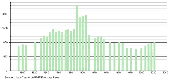 L'évolution du nombre d'habitants est connue à travers les recensements de la population effectués dans la commune depuis 1793. Pour les communes de moins de 10 000 habitants, une enquête de recensement portant sur toute la population est réalisée tous les cinq ans, les populations légales des années intermédiaires étant quant à elles estimées par interpolation ou extrapolation[18]. Pour la commune, le premier recensement exhaustif entrant dans le cadre du nouveau dispositif a été réalisé en 2006[19].
