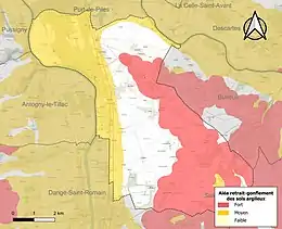 Les mouvements de terrains susceptibles de se produire sur la commune sont des affaissements et effondrements liés aux cavités souterraines (hors mines) et des tassements différentiels[22]. Afin de mieux appréhender le risque d’affaissement de terrain, un inventaire national permet de localiser les éventuelles cavités souterraines sur la commune[23]. Le retrait-gonflement des sols argileux est susceptible d'engendrer des dommages importants aux bâtiments en cas d’alternance de périodes de sécheresse et de pluie[24]. 65,9 % de la superficie communale est en aléa moyen ou fort (79,5 % au niveau départemental et 48,5 % au niveau national)[Carte 2]. Depuis le , en application de la loi ÉLAN, différentes contraintes s'imposent aux vendeurs, maîtres d'ouvrages ou constructeurs de biens situés dans une zone classée en aléa moyen ou fort[Note 5],[25].