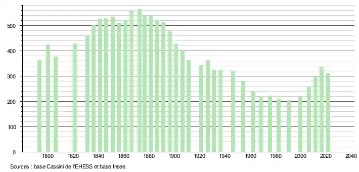 L'évolution du nombre d'habitants est connue à travers les recensements de la population effectués dans la commune depuis 1793. Pour les communes de moins de 10 000 habitants, une enquête de recensement portant sur toute la population est réalisée tous les cinq ans, les populations légales des années intermédiaires étant quant à elles estimées par interpolation ou extrapolation[17]. Pour la commune, le premier recensement exhaustif entrant dans le cadre du nouveau dispositif a été réalisé en 2006[18].