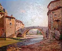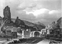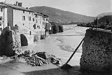 - Le 13 août 1868, les eaux s'élèvent de treize mètres au-dessus de l'étiage[47]. La magnanerie en bois sur pilotis située devant le 42 Grande rue est emportée et provoque un bouchon au niveau du pont : l'eau envahit toute la rue, montant jusqu'à la deuxième marche de l'église. Les dégâts sont tels qu'à la crue suivante de 1872, les travaux de remise en état ne sont pas encore achevés[48].