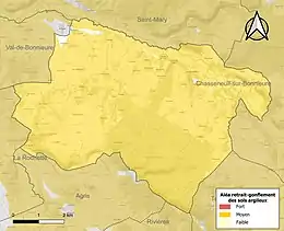 Le retrait-gonflement des sols argileux est susceptible d'engendrer des dommages importants aux bâtiments en cas d’alternance de périodes de sécheresse et de pluie. 99,1 % de la superficie communale est en aléa moyen ou fort (67,4 % au niveau départemental et 48,5 % au niveau national). Sur les 278 bâtiments dénombrés sur la commune en 2019, 267 sont en aléa moyen ou fort, soit 96 %, à comparer aux 81 % au niveau départemental et 54 % au niveau national. Une cartographie de l'exposition du territoire national au retrait gonflement des sols argileux est disponible sur le site du BRGM[20],[Carte 3].