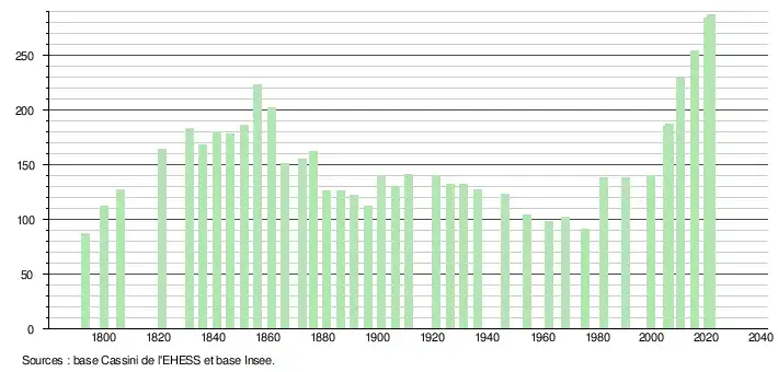 L'évolution du nombre d'habitants est connue à travers les recensements de la population effectués dans la commune depuis 1793. Pour les communes de moins de 10 000 habitants, une enquête de recensement portant sur toute la population est réalisée tous les cinq ans, les populations légales des années intermédiaires étant quant à elles estimées par interpolation ou extrapolation[18]. Pour la commune, le premier recensement exhaustif entrant dans le cadre du nouveau dispositif a été réalisé en 2005[19].