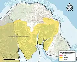 Le retrait-gonflement des sols argileux est susceptible d'engendrer des dommages importants aux bâtiments en cas d’alternance de périodes de sécheresse et de pluie. 49,9 % de la superficie communale est en aléa moyen ou fort (54,2 % au niveau départemental et 48,5 % au niveau national). Sur les 1 969 bâtiments dénombrés sur la commune en 2019, 276 sont en aléa moyen ou fort, soit 14 %, à comparer aux 57 % au niveau départemental et 54 % au niveau national. Une cartographie de l'exposition du territoire national au retrait gonflement des sols argileux est disponible sur le site du BRGM[25],[Carte 2].