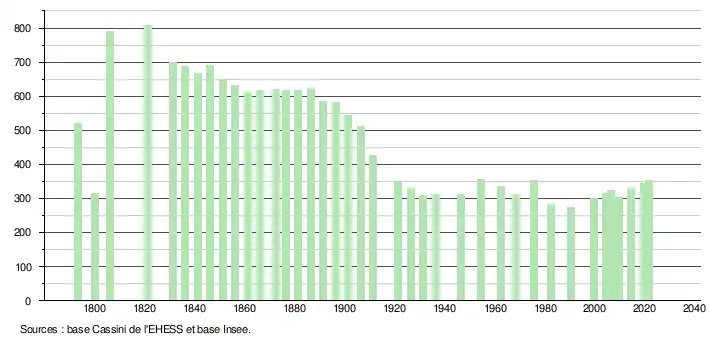 L'évolution du nombre d'habitants est connue à travers les recensements de la population effectués dans la commune depuis 1793. Pour les communes de moins de 10 000 habitants, une enquête de recensement portant sur toute la population est réalisée tous les cinq ans, les populations légales des années intermédiaires étant quant à elles estimées par interpolation ou extrapolation[16]. Pour la commune, le premier recensement exhaustif entrant dans le cadre du nouveau dispositif a été réalisé en 2004[17].