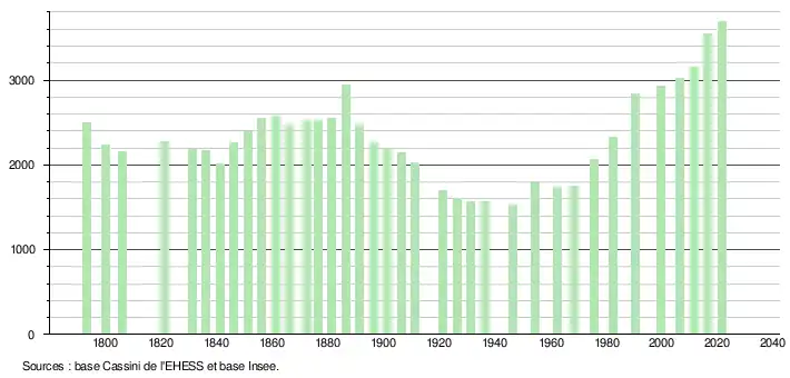 L'évolution du nombre d'habitants est connue à travers les recensements de la population effectués dans la commune depuis 1793. Pour les communes de moins de 10 000 habitants, une enquête de recensement portant sur toute la population est réalisée tous les cinq ans, les populations légales des années intermédiaires étant quant à elles estimées par interpolation ou extrapolation[23]. Pour la commune, le premier recensement exhaustif entrant dans le cadre du nouveau dispositif a été réalisé en 2006[24].