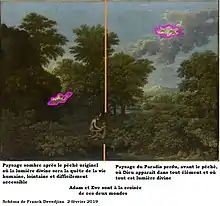 Adam et Ève forment un couple de petits personnages statiques dans une forêt calme, éclipsé par la végétation luxuriante. La figure en robe du Créateur peut être vue en haut sur un nuage entouré d'un halo de lumière. Il est figuré loin du spectateur, s'éloignant comme s'il était conscient de ce qui est à venir. La disposition des personnages dans la composition rappelle les représentations classiques de miniatures médiévales.