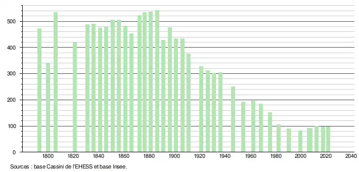 L'évolution du nombre d'habitants est connue à travers les recensements de la population effectués dans la commune depuis 1793. Pour les communes de moins de 10 000 habitants, une enquête de recensement portant sur toute la population est réalisée tous les cinq ans, les populations légales des années intermédiaires étant quant à elles estimées par interpolation ou extrapolation[39]. Pour la commune, le premier recensement exhaustif entrant dans le cadre du nouveau dispositif a été réalisé en 2007[40].