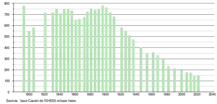 L'évolution du nombre d'habitants est connue à travers les recensements de la population effectués dans la commune depuis 1793. Pour les communes de moins de 10 000 habitants, une enquête de recensement portant sur toute la population est réalisée tous les cinq ans, les populations légales des années intermédiaires étant quant à elles estimées par interpolation ou extrapolation[21]. Pour la commune, le premier recensement exhaustif entrant dans le cadre du nouveau dispositif a été réalisé en 2006[22].