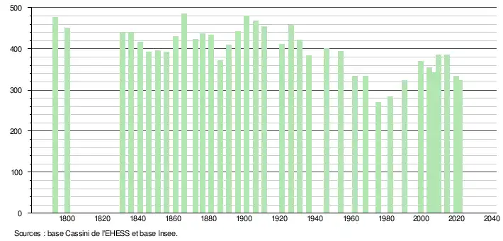 L'évolution du nombre d'habitants est connue à travers les recensements de la population effectués dans la commune depuis 1793. Pour les communes de moins de 10 000 habitants, une enquête de recensement portant sur toute la population est réalisée tous les cinq ans, les populations légales des années intermédiaires étant quant à elles estimées par interpolation ou extrapolation[17]. Pour la commune, le premier recensement exhaustif entrant dans le cadre du nouveau dispositif a été réalisé en 2004[18].