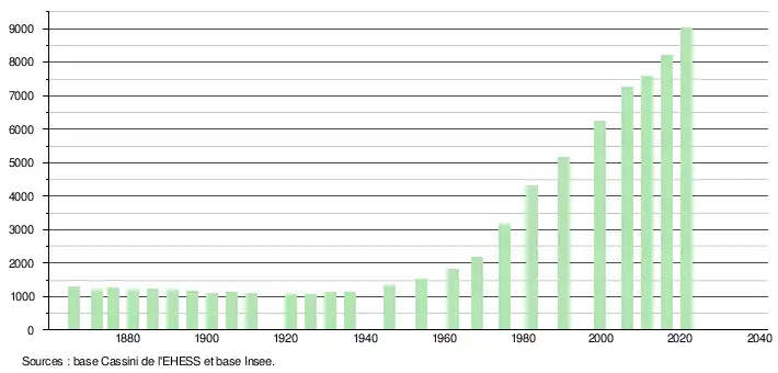 L'évolution du nombre d'habitants est connue à travers les recensements de la population effectués dans la commune depuis 1866. Pour les communes de moins de 10 000 habitants, une enquête de recensement portant sur toute la population est réalisée tous les cinq ans, les populations légales des années intermédiaires étant quant à elles estimées par interpolation ou extrapolation[24]. Pour la commune, le premier recensement exhaustif entrant dans le cadre du nouveau dispositif a été réalisé en 2006[25].
