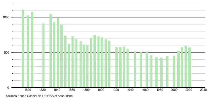 L'évolution du nombre d'habitants est connue à travers les recensements de la population effectués dans la commune depuis 1793. Pour les communes de moins de 10 000 habitants, une enquête de recensement portant sur toute la population est réalisée tous les cinq ans, les populations légales des années intermédiaires étant quant à elles estimées par interpolation ou extrapolation[12]. Pour la commune, le premier recensement exhaustif entrant dans le cadre du nouveau dispositif a été réalisé en 2005[13].