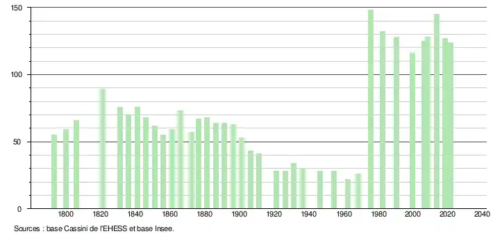 L'évolution du nombre d'habitants est connue à travers les recensements de la population effectués dans la commune depuis 1793. Pour les communes de moins de 10 000 habitants, une enquête de recensement portant sur toute la population est réalisée tous les cinq ans, les populations légales des années intermédiaires étant quant à elles estimées par interpolation ou extrapolation[17]. Pour la commune, le premier recensement exhaustif entrant dans le cadre du nouveau dispositif a été réalisé en 2008[18].