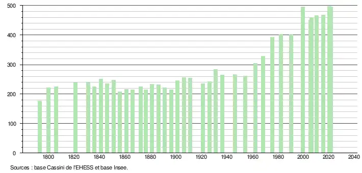 L'évolution du nombre d'habitants est connue à travers les recensements de la population effectués dans la commune depuis 1793. Pour les communes de moins de 10 000 habitants, une enquête de recensement portant sur toute la population est réalisée tous les cinq ans, les populations légales des années intermédiaires étant quant à elles estimées par interpolation ou extrapolation[19]. Pour la commune, le premier recensement exhaustif entrant dans le cadre du nouveau dispositif a été réalisé en 2005[20].