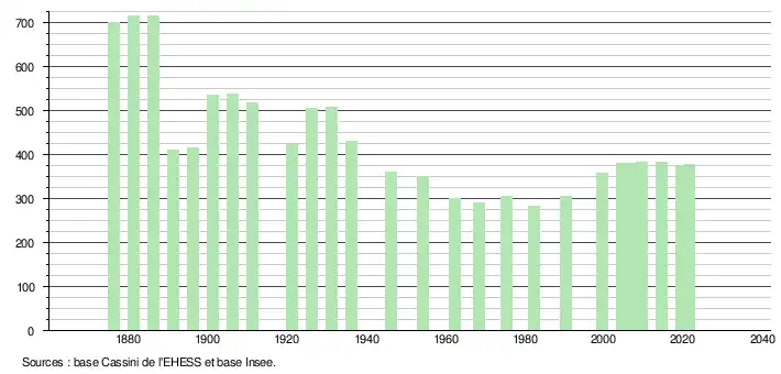 L'évolution du nombre d'habitants est connue à travers les recensements de la population effectués dans la commune depuis 1876. Pour les communes de moins de 10 000 habitants, une enquête de recensement portant sur toute la population est réalisée tous les cinq ans, les populations légales des années intermédiaires étant quant à elles estimées par interpolation ou extrapolation[32]. Pour la commune, le premier recensement exhaustif entrant dans le cadre du nouveau dispositif a été réalisé en 2004[33].