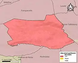 Le retrait-gonflement des sols argileux est susceptible d'engendrer des dommages importants aux bâtiments en cas d’alternance de périodes de sécheresse et de pluie. La totalité de la commune est en aléa moyen ou fort (88,8 % au niveau départemental et 48,5 % au niveau national). Sur les 194 bâtiments dénombrés sur la commune en 2019, 194 sont en aléa moyen ou fort, soit 100 %, à comparer aux 98 % au niveau départemental et 54 % au niveau national. Une cartographie de l'exposition du territoire national au retrait gonflement des sols argileux est disponible sur le site du BRGM[27],[Carte 3].