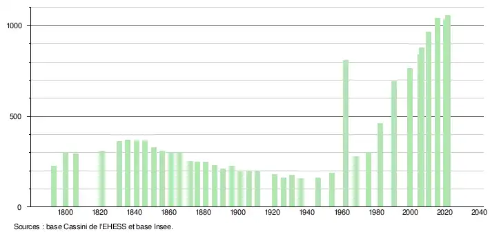 L'évolution du nombre d'habitants est connue à travers les recensements de la population effectués dans la commune depuis 1793. Pour les communes de moins de 10 000 habitants, une enquête de recensement portant sur toute la population est réalisée tous les cinq ans, les populations légales des années intermédiaires étant quant à elles estimées par interpolation ou extrapolation[18]. Pour la commune, le premier recensement exhaustif entrant dans le cadre du nouveau dispositif a été réalisé en 2005[19].