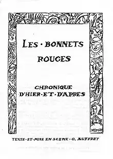 Textes historiques en écho aux écrits d'aujourd'hui, musique de jazz et projections audiovisuelles pour dissoudre « hier et aujourd'hui » dans une temporalité chimérique. La première pièce de théâtre sur les Bonnets rouges est donc jouée le à Landerneau, sur cette même place du Marché où furent pendus des insurgés. Festival prolongé avec Alan Stivell par une soirée cabaret musicale et poétique[13]. L'accueil des critiques est illustré par le magazine de l'UDB de où Le Peuple Breton écrit: « Le texte de Gérard Auffret est un beau texte efficace » et conclut « le théâtre populaire breton ne serait-il pas réinventé ». Des tournées s'ensuivent en pays Bigouden auprès des paroisses dont les clochers furent décapités pour avoir « sonner le tocsin de la révolte », puis dans le Morbihan et à Lyon.