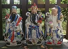 (chinois : 禄星 ; pinyin : ; EFEO : Fu Sing) « L'Étoile/Astre du Bonheur » ou « L'Étoile/Astre de la Bonne Fortune », plus connu en tant que Fú Shén (福神) « L'Esprit/Dieu du Bonheur ». L'histoire raconte qu'il s'appelait autrefois Yáng Chéng (陽城) et qu'il exerça la charge de Juge criminel de Dào Zhōu (道州) au Hú Nán (湖南). L'Empereur Wǔ Dì (武帝) de la Dynastie Liáng (梁朝) (502-557 ap. J.-C.) avait coutume de recruter des gens de petite taille, voir des pygmées comme comédiens ou serviteurs du palais, pour son plaisir personnel. Chaque année, c'était par centaines que ces pauvres gens se voyaient désignés pour cette corvée, si bien que les liens de parenté et la constitution même des familles s'en trouvaient gravement atteint. Quand Yáng Chéng fut chargé d'administrer cette ville, il rédigea un placet où il déclara que ces personnes étaient au même titre que les autres, des sujets de l'Empereur et non ses esclaves. Au lieu de s'en offusquer, tout au contraire, l'Empereur fut touché par cette missive, et dès ce jour, il cessa de recruter ces pauvres gens. Pour le remercier de ses bienfaits, les habitants de cette préfecture élevèrent des statues en son honneur et lui firent des sacrifices. Dans toute la région il fut vénéré comme « l'Esprit/ le Dieu du Bonheur ». Cette dévotion se répandit dans tout l'empire, lettrés et plébéiens l'honorèrent ; dès lors il fut considéré comme « l'Esprit/ le Dieu du Bonheur et de la Félicité »[1].