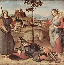 En effet, selon Erwin Panofsky, il s'agit d'une représentation des Hespérides, tenant leur pomme comme une récompense faite au héros, le chevalier représenté sur l'autre tableau du diptyque, qui serait selon lui Scipion l'Africain. L'ensemble aurait donc été peint pour Scipion di Tommaso Borghese à l'occasion de sa communion en 1500, alors que cette famille et le peintre résidaient alors à Sienne. Raphaël travaillait alors à la bibliothèque de la cathédrale de la ville qui conservait à cette époque une statue antique représentant ce même thème[1].