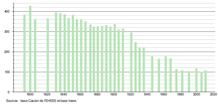 L'évolution du nombre d'habitants est connue à travers les recensements de la population effectués dans la commune depuis 1793. À partir du , les populations légales des communes sont publiées annuellement dans le cadre d'un recensement qui repose désormais sur une collecte d'information annuelle, concernant successivement tous les territoires communaux au cours d'une période de cinq ans. Pour les communes de moins de 10 000 habitants, une enquête de recensement portant sur toute la population est réalisée tous les cinq ans, les populations légales des années intermédiaires étant quant à elles estimées par interpolation ou extrapolation[4]. Pour la commune, le premier recensement exhaustif entrant dans le cadre du nouveau dispositif a été réalisé en 2005[5],[Note 1].