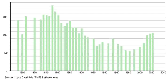 L'évolution du nombre d'habitants est connue à travers les recensements de la population effectués dans la commune depuis 1793. Pour les communes de moins de 10 000 habitants, une enquête de recensement portant sur toute la population est réalisée tous les cinq ans, les populations légales des années intermédiaires étant quant à elles estimées par interpolation ou extrapolation[19]. Pour la commune, le premier recensement exhaustif entrant dans le cadre du nouveau dispositif a été réalisé en 2007[20].