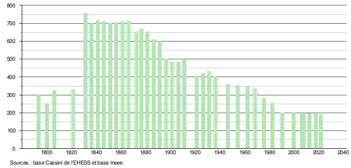 L'évolution du nombre d'habitants est connue à travers les recensements de la population effectués dans la commune depuis 1793. Pour les communes de moins de 10 000 habitants, une enquête de recensement portant sur toute la population est réalisée tous les cinq ans, les populations légales des années intermédiaires étant quant à elles estimées par interpolation ou extrapolation[20]. Pour la commune, le premier recensement exhaustif entrant dans le cadre du nouveau dispositif a été réalisé en 2007[21].
