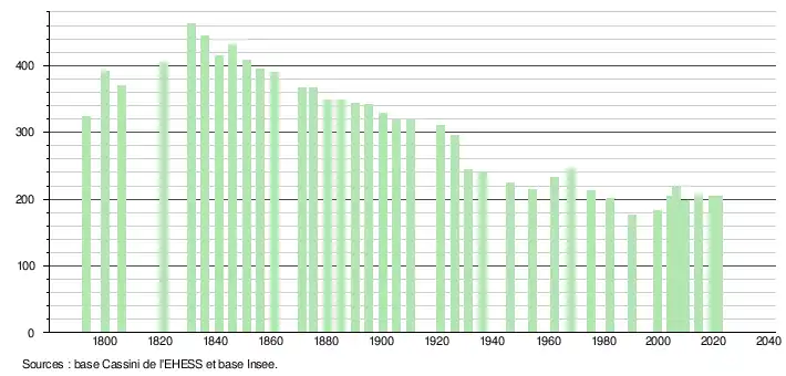 L'évolution du nombre d'habitants est connue à travers les recensements de la population effectués dans la commune depuis 1793. Pour les communes de moins de 10 000 habitants, une enquête de recensement portant sur toute la population est réalisée tous les cinq ans, les populations légales des années intermédiaires étant quant à elles estimées par interpolation ou extrapolation[15]. Pour la commune, le premier recensement exhaustif entrant dans le cadre du nouveau dispositif a été réalisé en 2004[16].