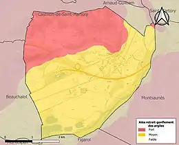 Le retrait-gonflement des sols argileux est susceptible d'engendrer des dommages importants aux bâtiments en cas d’alternance de périodes de sécheresse et de pluie. La totalité de la commune est en aléa moyen ou fort (88,8 % au niveau départemental et 48,5 % au niveau national). Sur les 221 bâtiments dénombrés sur la commune en 2019, 221 sont en aléa moyen ou fort, soit 100 %, à comparer aux 98 % au niveau départemental et 54 % au niveau national. Une cartographie de l'exposition du territoire national au retrait gonflement des sols argileux est disponible sur le site du BRGM[34],[Carte 3].