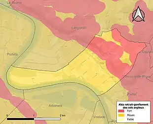 Le retrait-gonflement des sols argileux est susceptible d'engendrer des dommages importants aux bâtiments en cas d’alternance de périodes de sécheresse et de pluie. 99,9 % de la superficie communale est en aléa moyen ou fort (67,4 % au niveau départemental et 48,5 % au niveau national). Sur les 268 bâtiments dénombrés sur la commune en 2019, 268 sont en aléa moyen ou fort, soit 100 %, à comparer aux 84 % au niveau départemental et 54 % au niveau national. Une cartographie de l'exposition du territoire national au retrait gonflement des sols argileux est disponible sur le site du BRGM[25],[Carte 2].