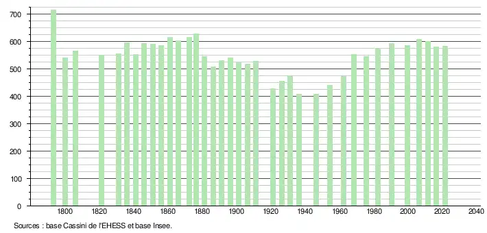 | L'évolution du nombre d'habitants est connue à travers les recensements de la population effectués dans la commune depuis 1793. Pour les communes de moins de 10 000 habitants, une enquête de recensement portant sur toute la population est réalisée tous les cinq ans, les populations légales des années intermédiaires étant quant à elles estimées par interpolation ou extrapolation[30]. Pour la commune, le premier recensement exhaustif entrant dans le cadre du nouveau dispositif a été réalisé en 2006[31]. En 2021, la commune comptait 584 habitants[Note 4], en augmentation de 1,04 % par rapport à 2015 (Gironde : +6,88 %, France hors Mayotte : +1,84 %). |