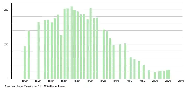 L'évolution du nombre d'habitants est connue à travers les recensements de la population effectués dans la commune depuis 1800. Pour les communes de moins de 10 000 habitants, une enquête de recensement portant sur toute la population est réalisée tous les cinq ans, les populations légales des années intermédiaires étant quant à elles estimées par interpolation ou extrapolation[10]. Pour la commune, le premier recensement exhaustif entrant dans le cadre du nouveau dispositif a été réalisé en 2008[11].