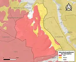 Les mouvements de terrains susceptibles de se produire sur la commune sont des affaissements et effondrements liés aux cavités souterraines (hors mines) et des tassements différentiels[21]. Afin de mieux appréhender le risque d’affaissement de terrain, un inventaire national permet de localiser les éventuelles cavités souterraines sur la commune[22]. Le retrait-gonflement des sols argileux est susceptible d'engendrer des dommages importants aux bâtiments en cas d’alternance de périodes de sécheresse et de pluie[23]. 96,1 % de la superficie communale est en aléa moyen ou fort (79,5 % au niveau départemental et 48,5 % au niveau national)[Carte 2]. Depuis le , en application de la loi ÉLAN, différentes contraintes s'imposent aux vendeurs, maîtres d'ouvrages ou constructeurs de biens situés dans une zone classée en aléa moyen ou fort[Note 5],[24].