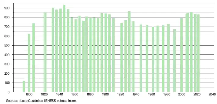 L'évolution du nombre d'habitants est connue à travers les recensements de la population effectués dans la commune depuis 1793. Pour les communes de moins de 10 000 habitants, une enquête de recensement portant sur toute la population est réalisée tous les cinq ans, les populations légales des années intermédiaires étant quant à elles estimées par interpolation ou extrapolation[18]. Pour la commune, le premier recensement exhaustif entrant dans le cadre du nouveau dispositif a été réalisé en 2007[19].