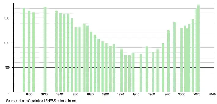 L'évolution du nombre d'habitants est connue à travers les recensements de la population effectués dans la commune depuis 1793. Pour les communes de moins de 10 000 habitants, une enquête de recensement portant sur toute la population est réalisée tous les cinq ans, les populations légales des années intermédiaires étant quant à elles estimées par interpolation ou extrapolation[13]. Pour la commune, le premier recensement exhaustif entrant dans le cadre du nouveau dispositif a été réalisé en 2004[14].