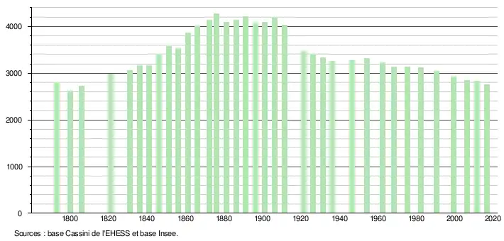 L'évolution du nombre d'habitants est connue à travers les recensements de la population effectués dans la commune depuis 1793. Pour les communes de moins de 10 000 habitants, une enquête de recensement portant sur toute la population est réalisée tous les cinq ans, les populations légales des années intermédiaires étant quant à elles estimées par interpolation ou extrapolation[32]. Pour la commune, le premier recensement exhaustif entrant dans le cadre du nouveau dispositif a été réalisé en 2006[33].