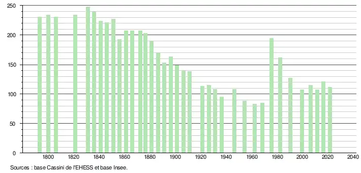 L'évolution du nombre d'habitants est connue à travers les recensements de la population effectués dans la commune depuis 1793. Pour les communes de moins de 10 000 habitants, une enquête de recensement portant sur toute la population est réalisée tous les cinq ans, les populations légales des années intermédiaires étant quant à elles estimées par interpolation ou extrapolation[14]. Pour la commune, le premier recensement exhaustif entrant dans le cadre du nouveau dispositif a été réalisé en 2006[15].
