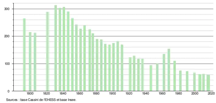 L'évolution du nombre d'habitants est connue à travers les recensements de la population effectués dans la commune depuis 1793. Pour les communes de moins de 10 000 habitants, une enquête de recensement portant sur toute la population est réalisée tous les cinq ans, les populations légales des années intermédiaires étant quant à elles estimées par interpolation ou extrapolation[6]. Pour la commune, le premier recensement exhaustif entrant dans le cadre du nouveau dispositif a été réalisé en 2005[7].