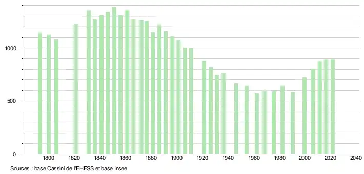 L'évolution du nombre d'habitants est connue à travers les recensements de la population effectués dans la commune depuis 1793. Pour les communes de moins de 10 000 habitants, une enquête de recensement portant sur toute la population est réalisée tous les cinq ans, les populations légales des années intermédiaires étant quant à elles estimées par interpolation ou extrapolation[22]. Pour la commune, le premier recensement exhaustif entrant dans le cadre du nouveau dispositif a été réalisé en 2006[23].