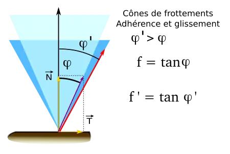 Si les corps ne glissent pas, la droite d’action transmissible peut s’écarter de la normale de contact jusqu’à une limite fixe (en rouge sur la figure). Le domaine ainsi délimité prend la forme d’un cône dit « cône de frottement d’adhérence ». Le demi angle au sommet est appelé angle d’adhérence. L'étude du cas à la frontière du cône est appelé équilibre strict.