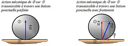 Dans un contact parfait, l’action mécanique transmissible par obstacle entre 2 solides ne peut être en tout point que normale au contact (perpendiculaire au plan tangent commun du contact). Pour que cette action mécanique puisse prendre une autre direction, il y a nécessité d’une composante tangentielle qui ne sera pas transmise par obstacle mais par frottement ou adhérence.