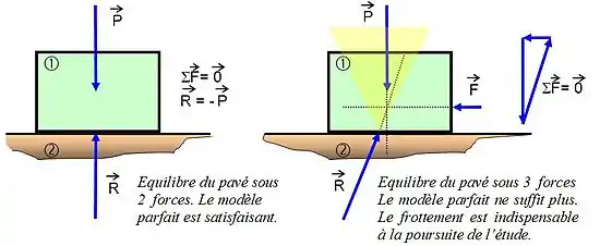 Cependant le frottement doit être considéré quand on souhaite déterminer son influence sur le problème étudié, où lorsque le modèle parfait n’apporte pas de solution possible (pavé qu’on pousse mais qui cependant reste immobile). Dans ce cas 2 types d’étude sont à envisager :