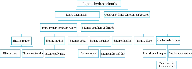 Une classification des liants est donnée dans la norme européenne EN 12-597. On différencie d'abord les liants bitumineux, qui regroupent des liants ou mélanges de liants et de granulats qui contiennent du bitume, et les liants à base de goudron. Les liants bitumineux sont ensuite classés selon l'origine du bitume : naturelle ou dérivée du pétrole. Les liants bitumineux issus du pétrole sont quant à eux différenciés selon leur structure :