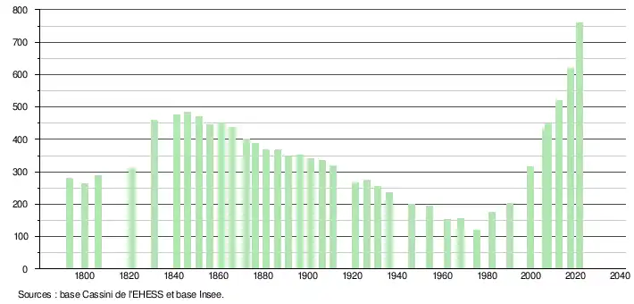 L'évolution du nombre d'habitants est connue à travers les recensements de la population effectués dans la commune depuis 1793. Pour les communes de moins de 10 000 habitants, une enquête de recensement portant sur toute la population est réalisée tous les cinq ans, les populations légales des années intermédiaires étant quant à elles estimées par interpolation ou extrapolation[28]. Pour la commune, le premier recensement exhaustif entrant dans le cadre du nouveau dispositif a été réalisé en 2007[29].