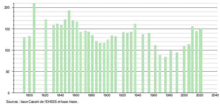 L'évolution du nombre d'habitants est connue à travers les recensements de la population effectués dans la commune depuis 1793. Pour les communes de moins de 10 000 habitants, une enquête de recensement portant sur toute la population est réalisée tous les cinq ans, les populations légales des années intermédiaires étant quant à elles estimées par interpolation ou extrapolation[27]. Pour la commune, le premier recensement exhaustif entrant dans le cadre du nouveau dispositif a été réalisé en 2005[28].