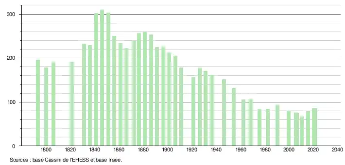 L'évolution du nombre d'habitants est connue à travers les recensements de la population effectués dans la commune depuis 1793. Pour les communes de moins de 10 000 habitants, une enquête de recensement portant sur toute la population est réalisée tous les cinq ans, les populations légales des années intermédiaires étant quant à elles estimées par interpolation ou extrapolation[53]. Pour la commune, le premier recensement exhaustif entrant dans le cadre du nouveau dispositif a été réalisé en 2005[54].
