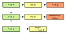 On appelle déréférencement l'action du système d'exploitation consistant à remplacer à la volée le nom du lien symbolique par celui qu'il pointe.