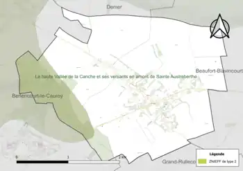Le territoire communal comprend une ZNIEFF de type 2[Note 2] : la haute vallée de la Canche et ses versants en amont de Sainte-Austreberthe qui se situe dans le pays du Ternois. Il offre un relief de coteau abrupt au Nord et des pentes douces au Sud. Le fond de vallée est constitué de pâturages et de zones de cultures. Les versants les plus pentus et inaccessibles accueillent des boisements[10].