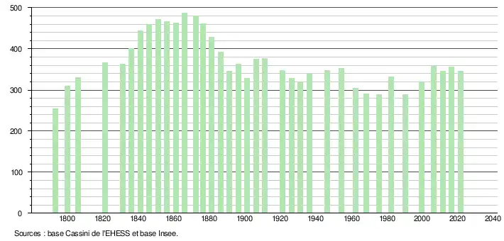 L'évolution du nombre d'habitants est connue à travers les recensements de la population effectués dans la commune depuis 1793. Pour les communes de moins de 10 000 habitants, une enquête de recensement portant sur toute la population est réalisée tous les cinq ans, les populations légales des années intermédiaires étant quant à elles estimées par interpolation ou extrapolation[18]. Pour la commune, le premier recensement exhaustif entrant dans le cadre du nouveau dispositif a été réalisé en 2006[19].